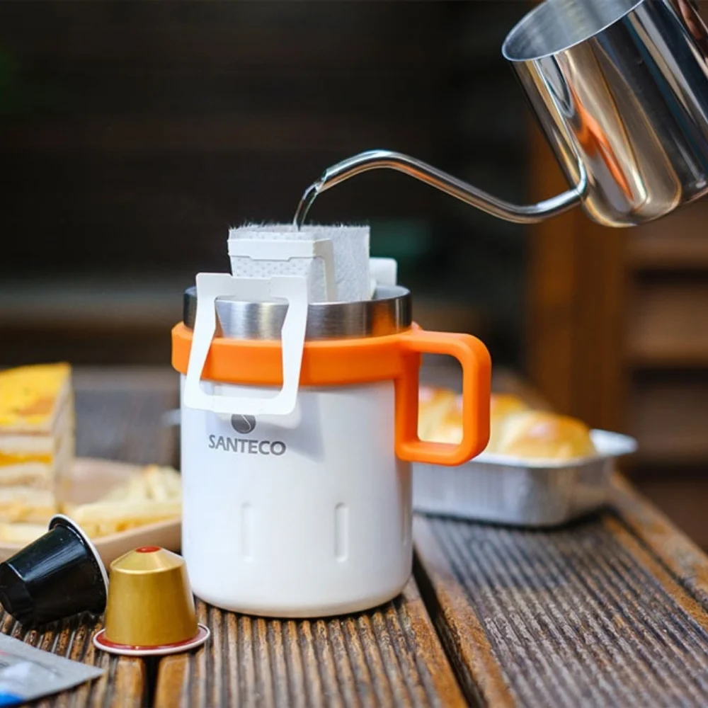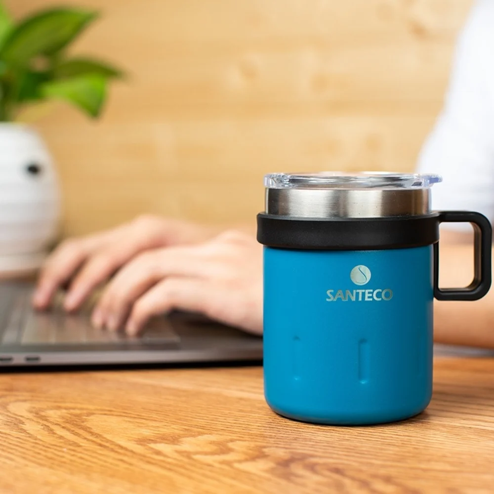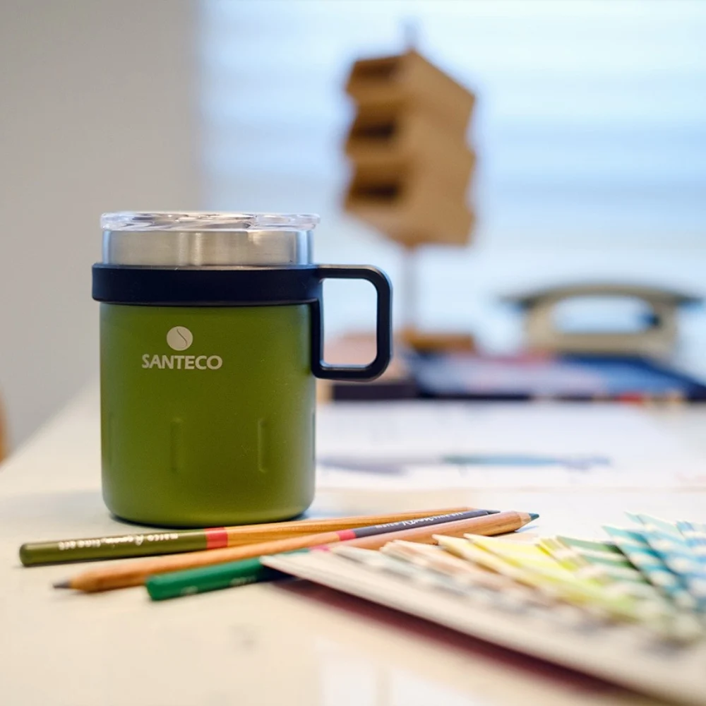 ماگ Santeco Kemi ۳۵۰ ml با بدنه استیل ۱۸/۸ ضدزنگ، عایق حرارتی دوجداره، درب شفاف ضد گردوغبار و دسته کارابینی — ایده‌آل برای کمپ، محل کار و خانه.
