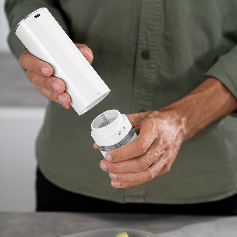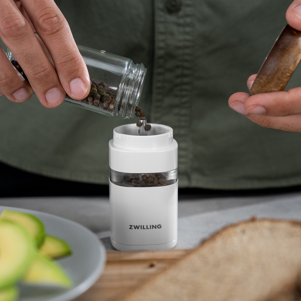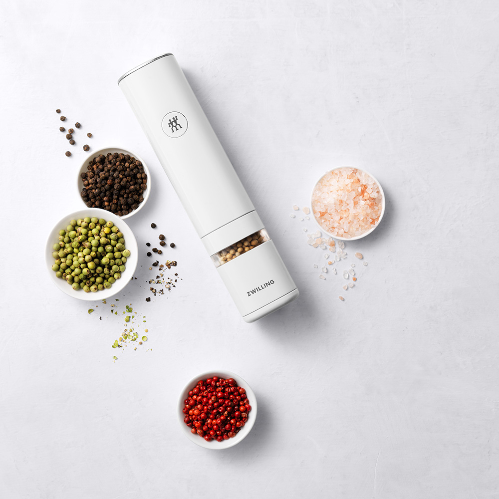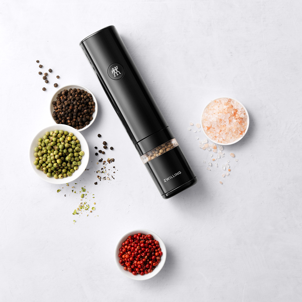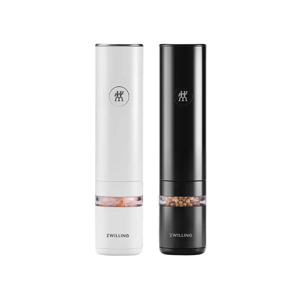 ست آسیابهای برقی ZWILLING Enfinigy Electric Salt and Pepper Mills ساخته برند آلمانی زولینگ، انتخابی ممتاز برای کسانی است که به طعم تازه و کیفیت آشپزی اهمیت میدهند. این مجموعه شامل دو آسیاب با طراحی استوانهای مدرن است که یکی برای نمک و دیگری برای فلفل یا سایر ادویهها کاربرد دارد.